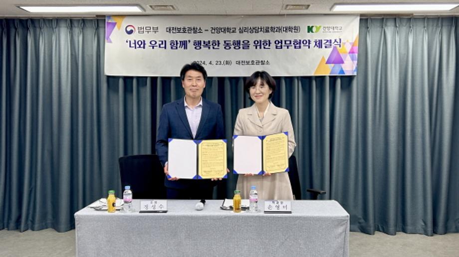 건양대학교(총장 김용하) 심리상담치료학과(학과장 손영미)와 법무부 대전보호관찰소(소장 정성수)가 지난 23일 보호관찰청소년의 건전한 성장과 심리지원을 위한 업무협약을 체결했다.