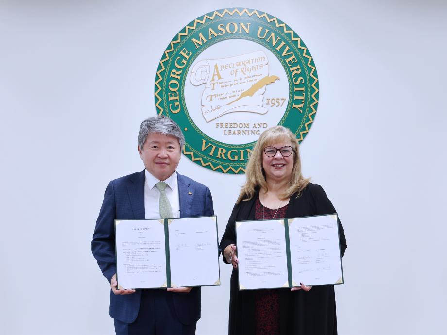 20일 건양대-조지메이슨대학교 MOU 사진(왼쪽부터 건양대 김용하 총장, 조지메이슨대 자넷뮤어 교학부총장).jpg